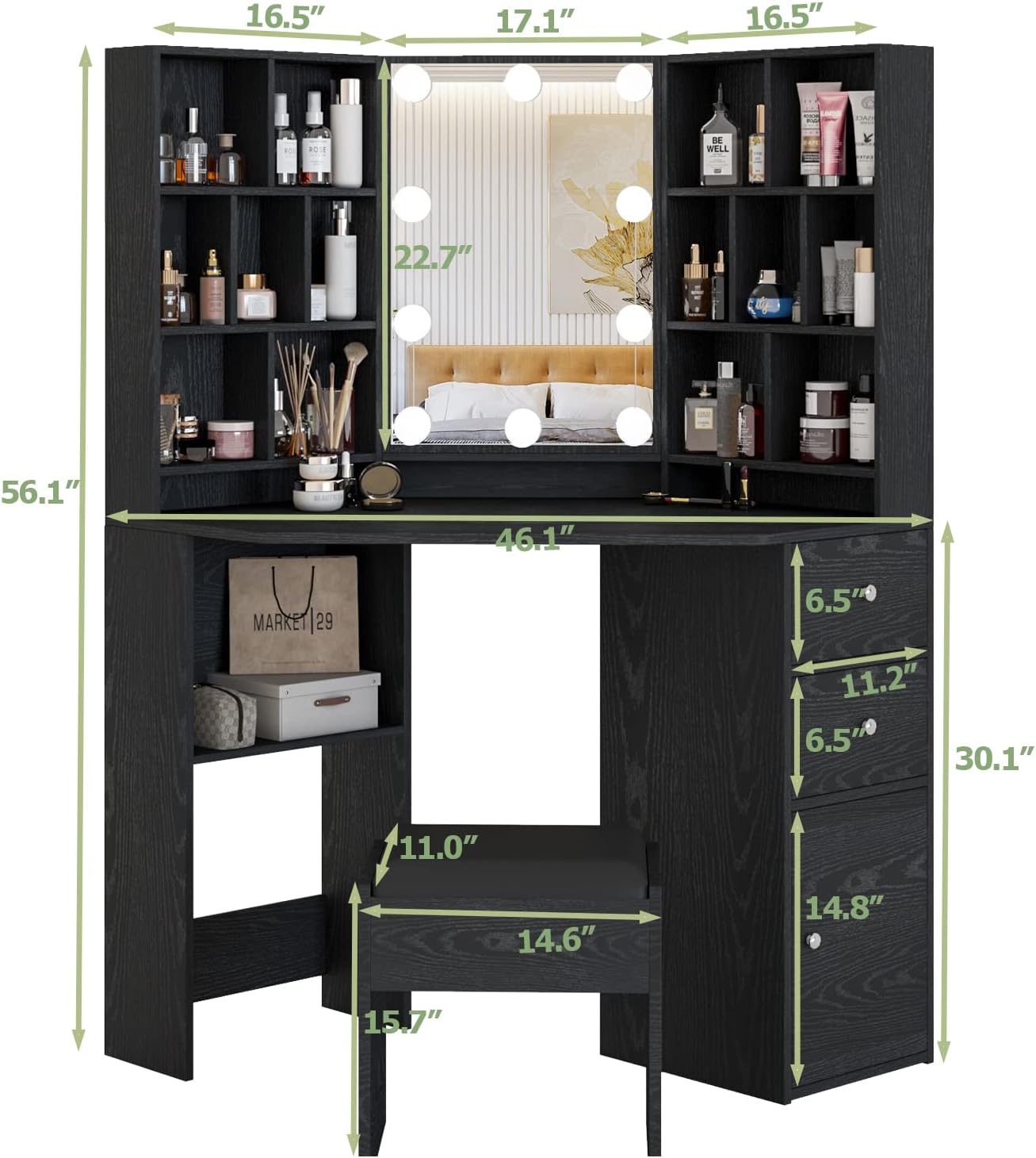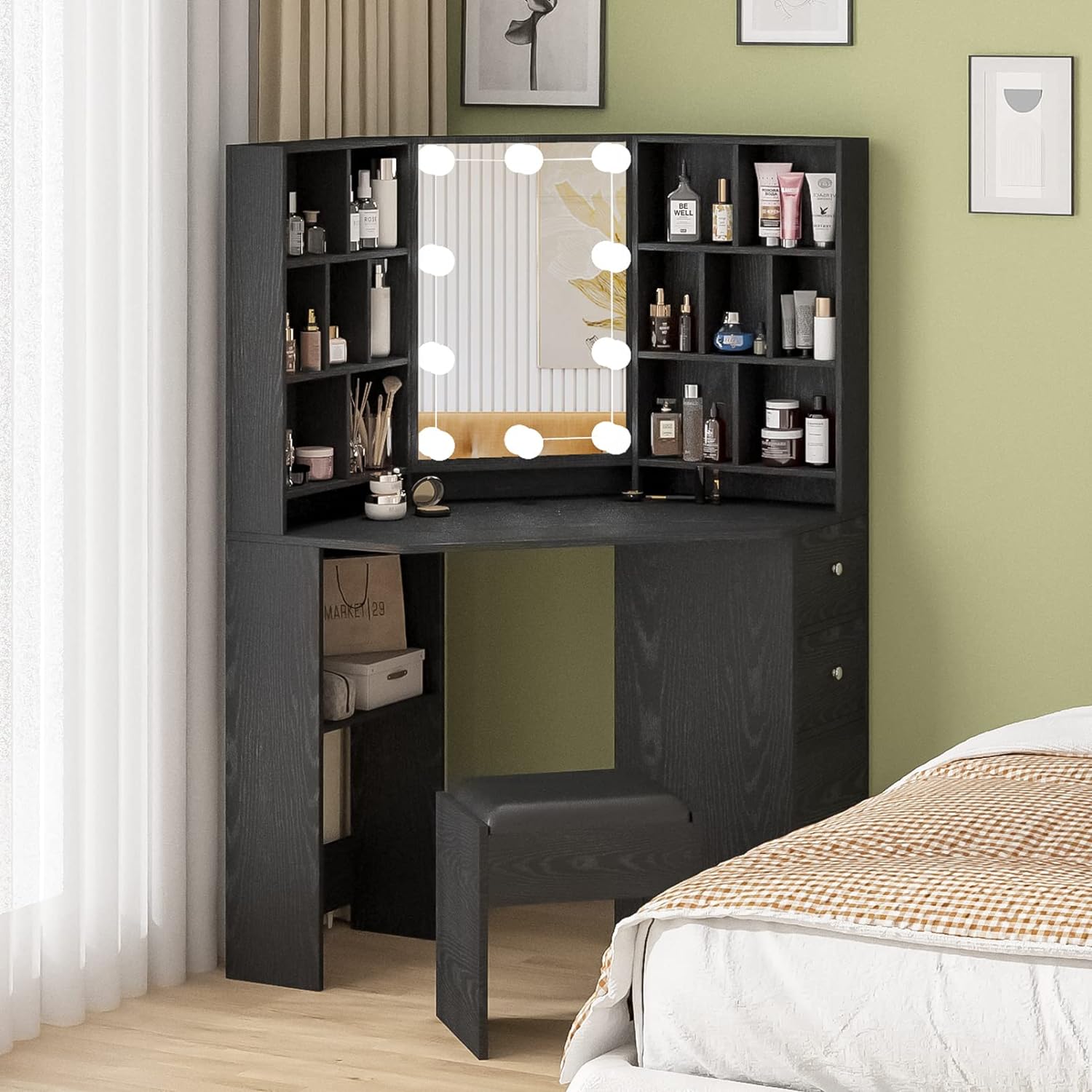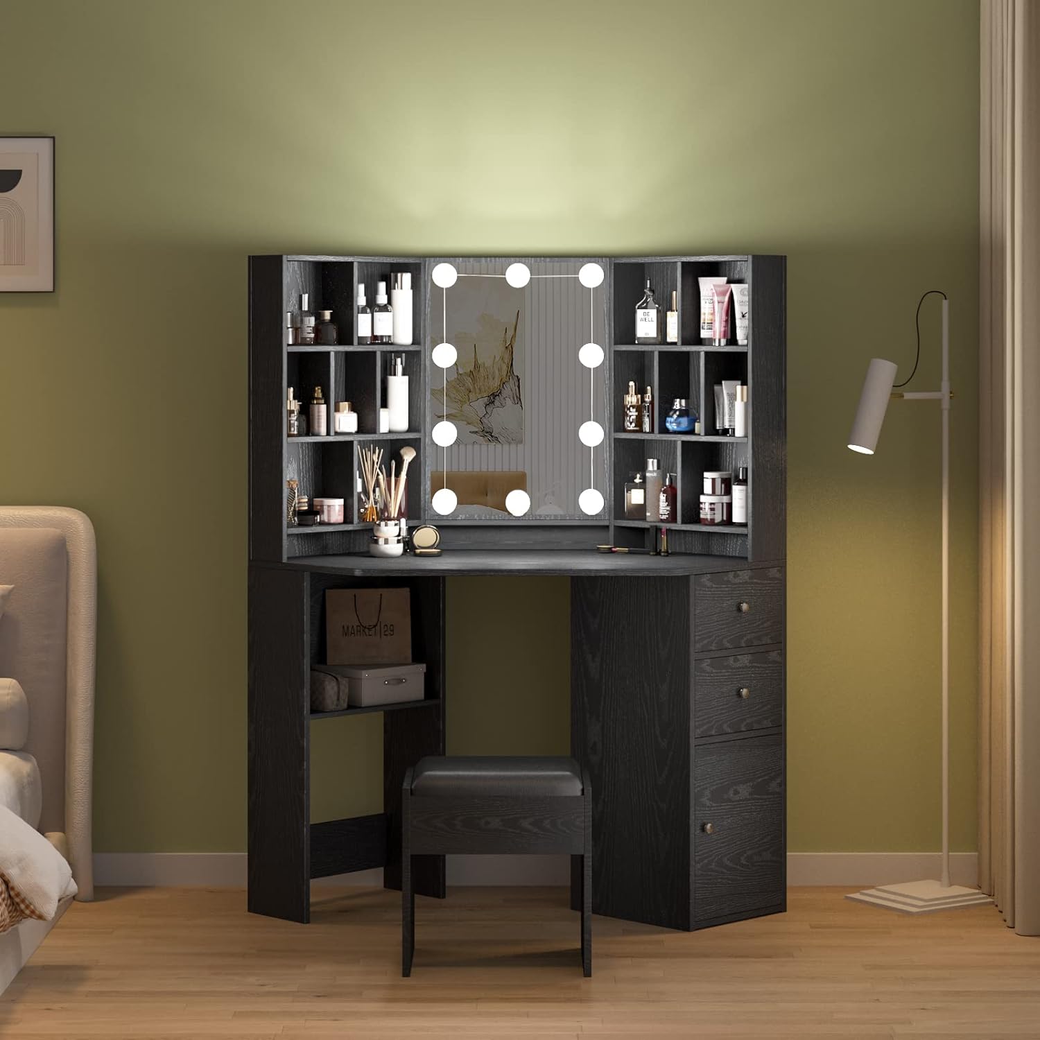 The design of the dressing table makes it closely fit with the corner of the bedroom or bathroom, saves space, and creates a corner suitable for storing and applying cosmetics.