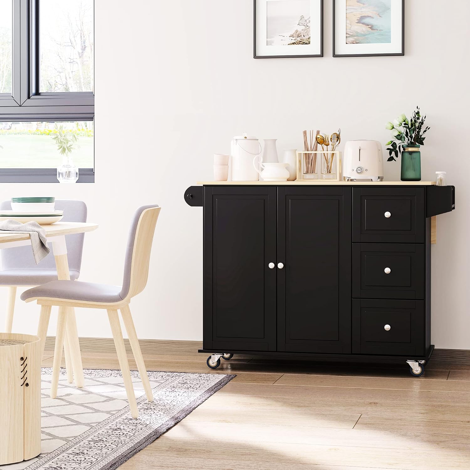 - Space Saving Storage: Do you have too many utensils and too much silverware to fit in your drawers? With drawers and a 2 door cabinets, this kitchen cart is great for keeping kitchenware organized.
