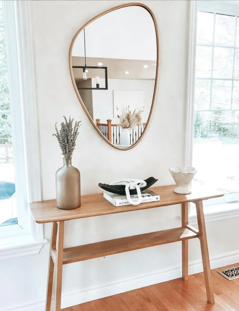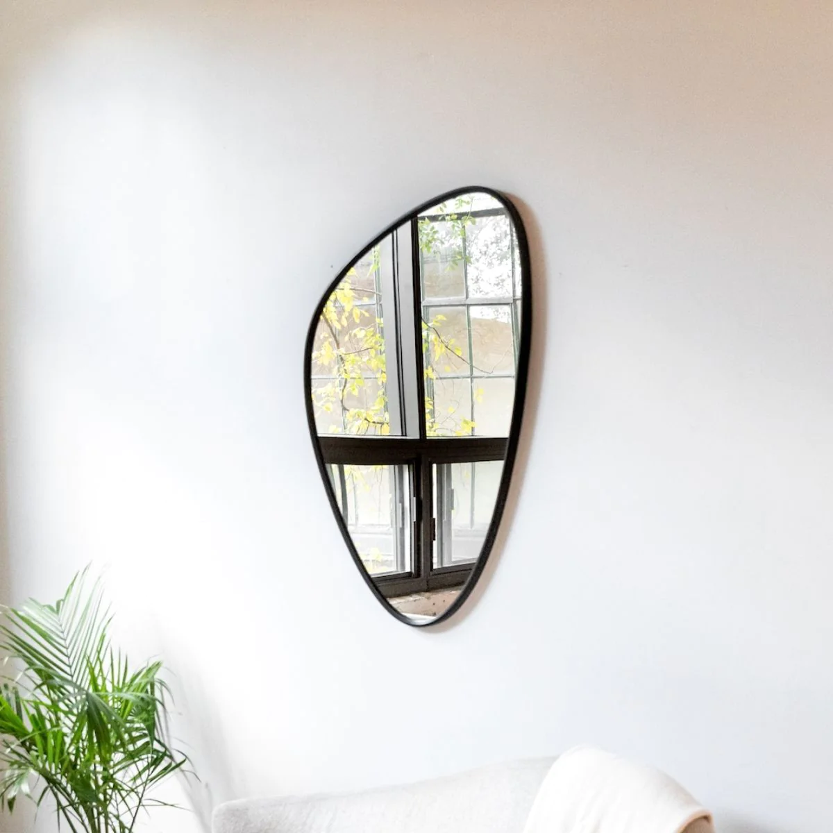 This irregular shaped mirror is our take on a mid-century modern classic mirror design. Framed in an thin iron frame with a brass finish, this mirror can bring retro vibes in the entryway, bedroom, living-room, or office. A West Mirrors Exclusive.